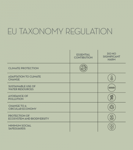 The binding requirements prevent the risk of greenwashing for investors. The classification system of the EU Taxonomy Regulation defines criteria for a "net-zero" footprint by 2050 ("climate protection") and it is additionally consistent with other broader environmental goals besides climate protection. Specific sustainability criteria have been defined for the six environmental targets. In addition, predefined minimum social standards must be met.